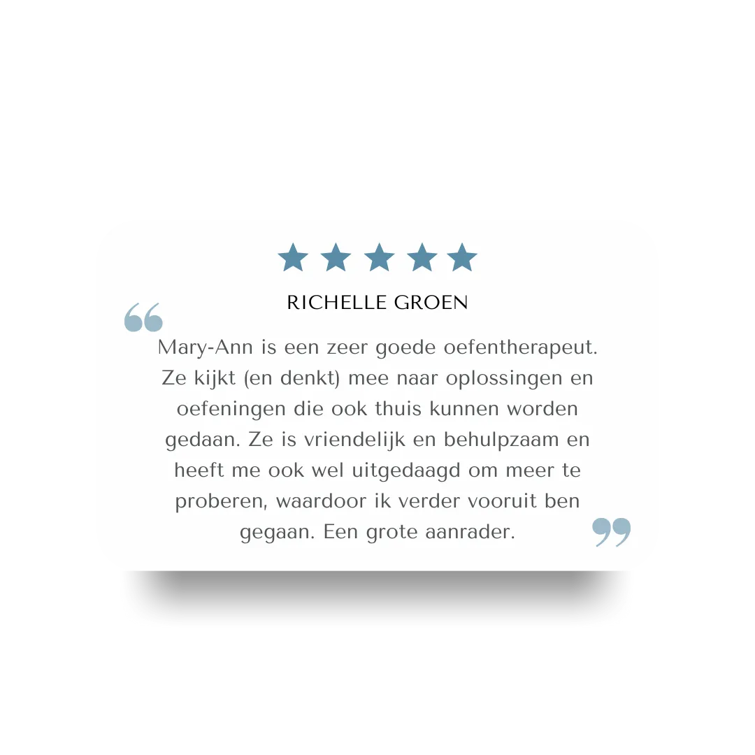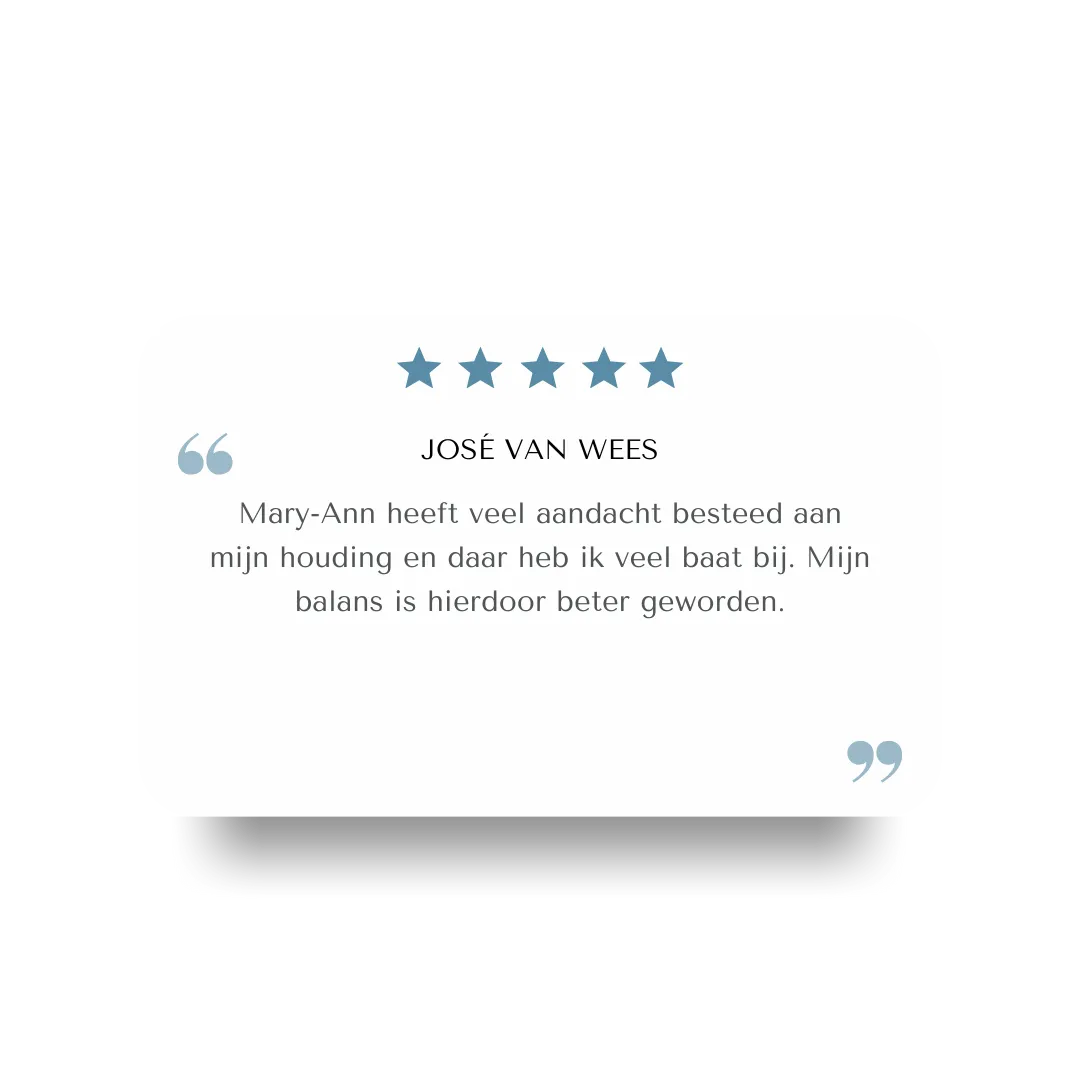 Mijn naam is Mary-Ann Tempelman. Ik ben oefentherapeut (Mensendieck/Cesar) en begeleid mensen die al langere tijd omgaan met lichamelijke klachten en willen begrijpen wat hun lichaam hen probeert te vertellen.