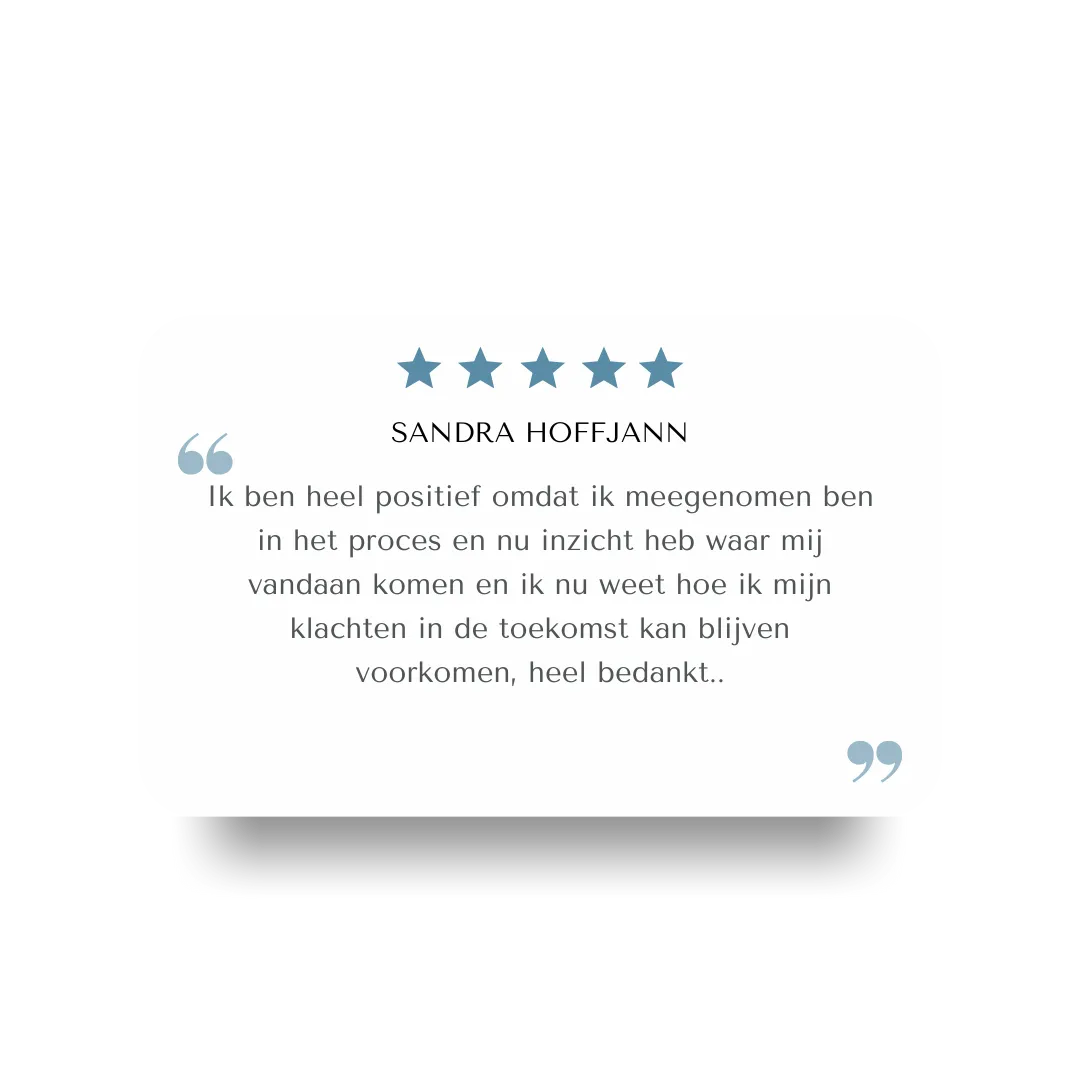 Die ervaring neem ik mee in mijn werk. Ik weet hoe beperkend pijn kan zijn en hoe waardevol het is om te ontdekken dat herstel soms juist in kleine, bewuste stappen zit. Daarom begeleid ik anderen bij het herkennen en doorbreken van patronen die klachten in stand houden.